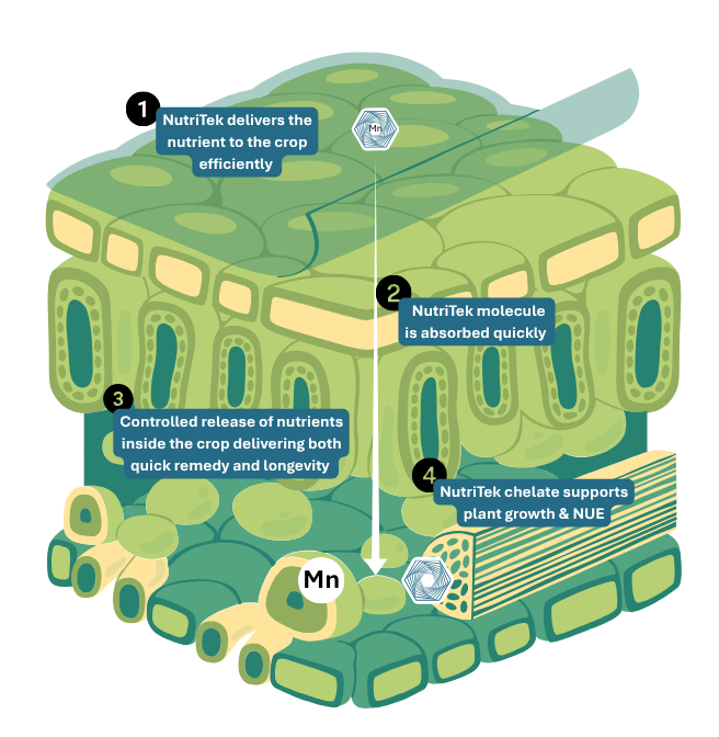 NutriTek foliar products contain a proprietary chelation technology that protects the nutrient from sequestration in the spray tank and when entering the crop leaves. This protection means that more nutrient is delivered and utilised by the crop.